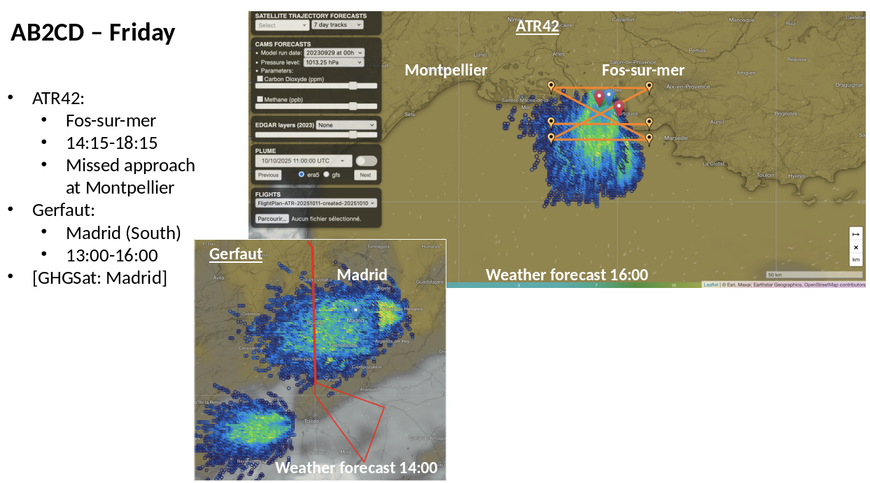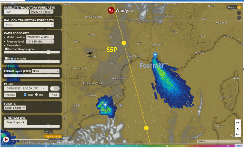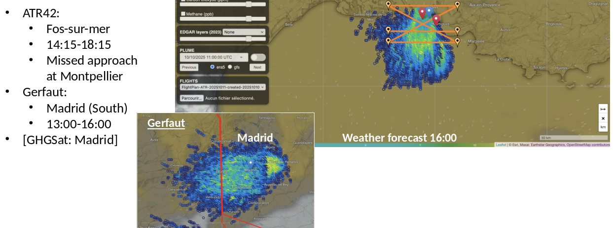L’équipe d’AERIS/ESPRI était présente durant l’intégralité de la campagne afin d’apporter un support informatique aux scientifiques et assurer le maintien du site opérationnel de la campagne. Une nouveauté durant cette campagne : la visualisation des simulations des panaches de composés atmosphérique ! Une fonctionnalité de cartographie (tracer les trajectoires satellites et afficher les coordonnées) a été implémentée pour cette campagne sur une interface basée sur Windy ainsi que la visualisation des couches d’émissions de CH4 et CO2 provenant de la base de données EDGAR.