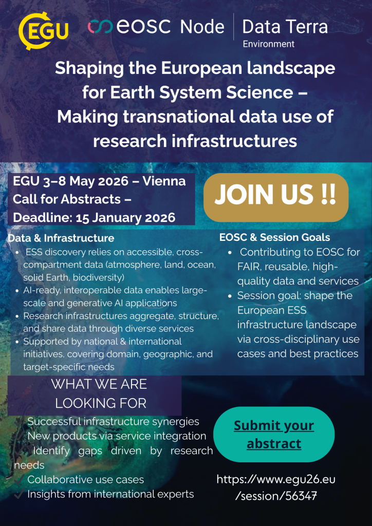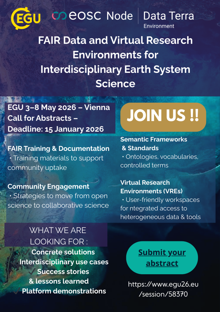 A l’occasion de l’EGU 2026, Data Terra co-organise 2 sessions. Une session dédiée aux données FAIR et aux environnements virtuels de recherche dans le domaine du Système Terre. Une autre dédiée aux infrastructures de recherche européennes dans le domaine du Système Terre.
